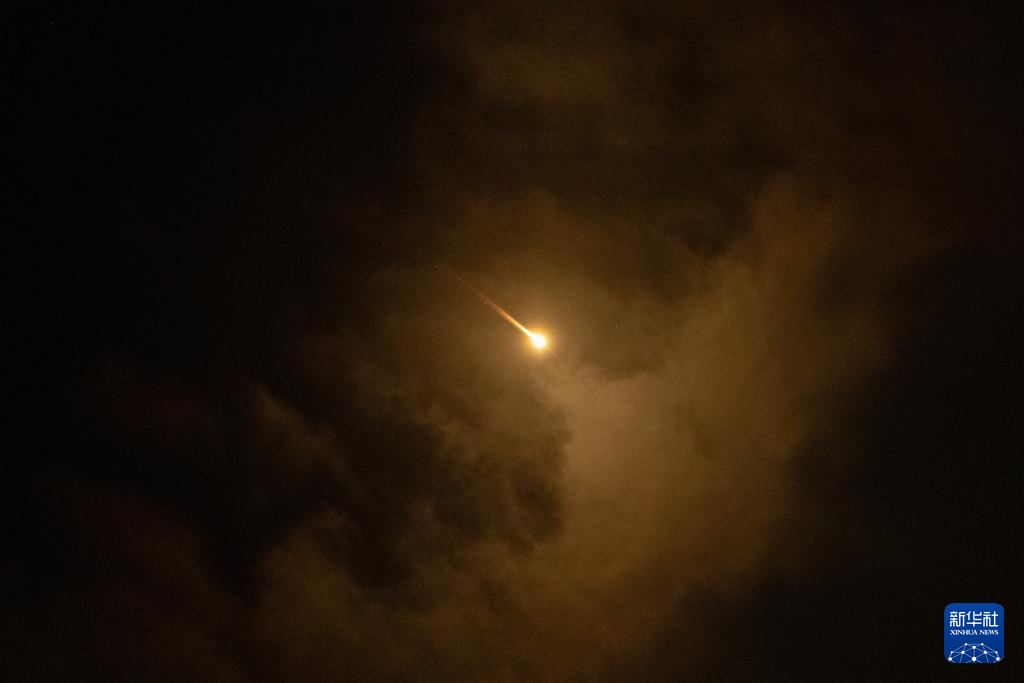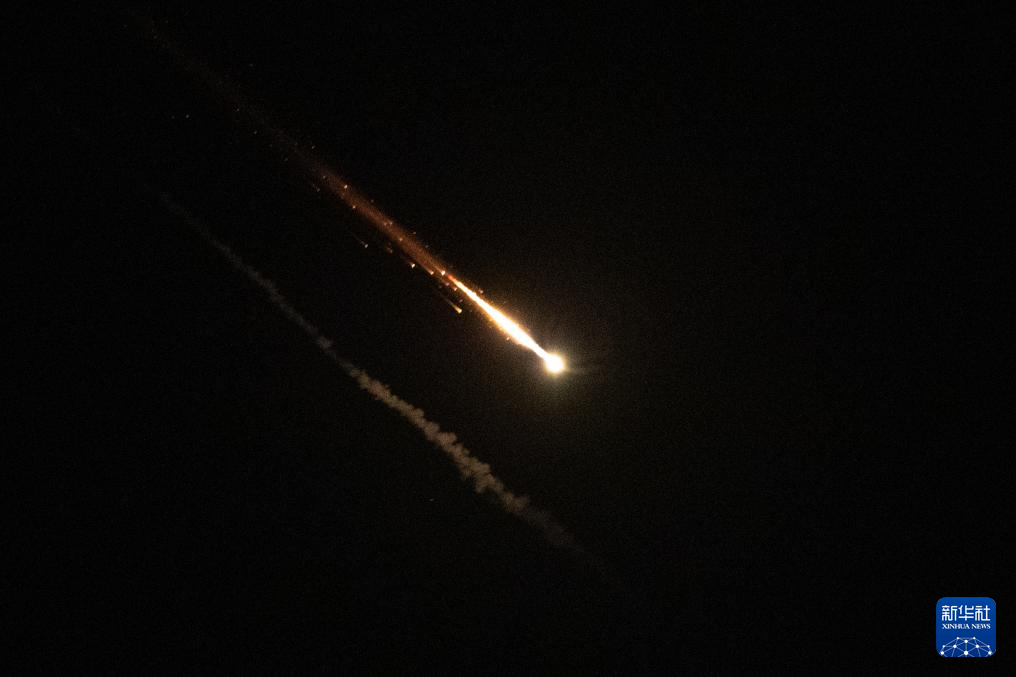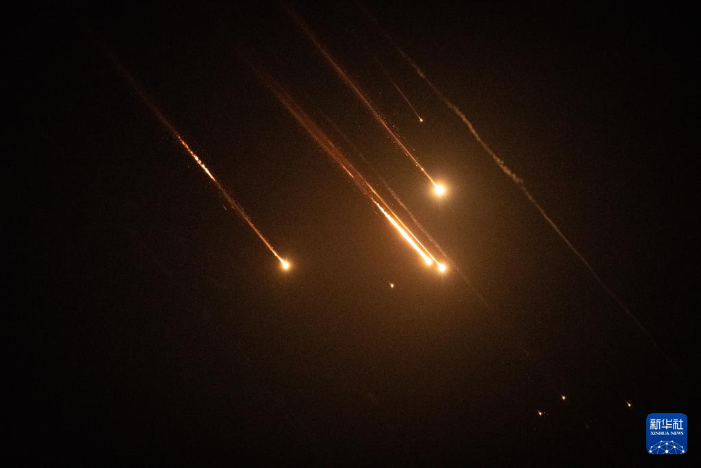 10月1日,以军防空系统拦截的发射物从耶路撒冷上空飞过。新华社记者 陈君清 摄