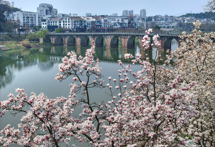 这是2024年3月12日在安徽省黄山市歙县新安江畔多景园拍摄的玉兰花(无人机照片)。新华社发(施亚磊摄)