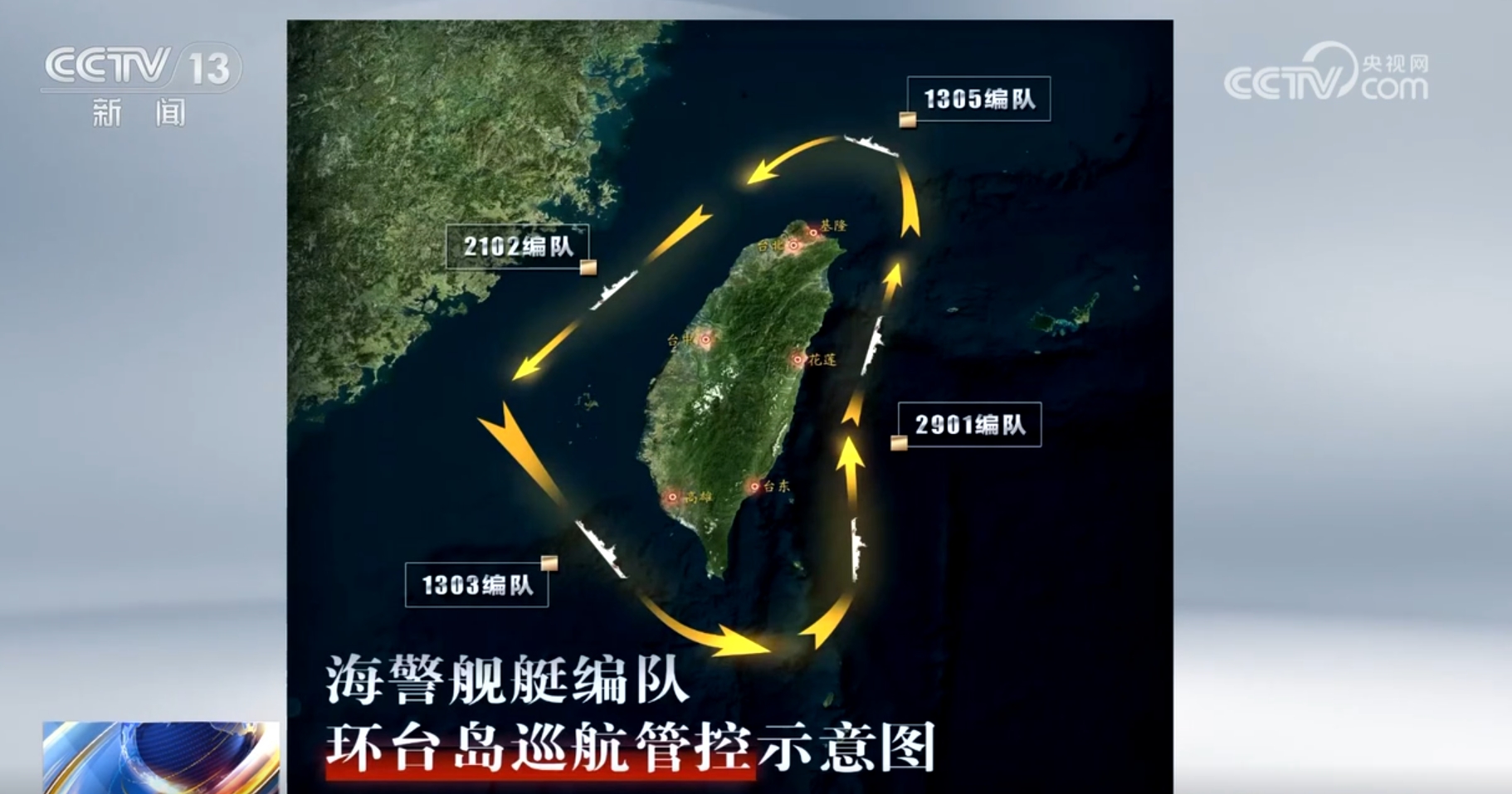 中国海警局新闻发言人刘德军表示,10月14日,海警2901编队、1305编队、1303编队、2102编队位台岛周边海域开展执法巡查,环台岛巡航管控,这是按一个中国原则依法管控台岛的实际行动。