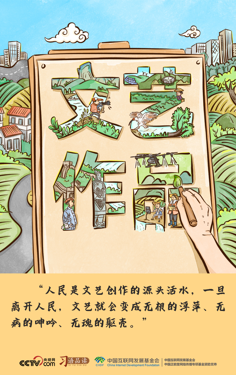 2014年10月15日,在文艺工作座谈会上,习近平总书记深刻揭示了文艺创作与人民之间的联系。他指出,人民是文艺创作的源头活水,一旦离开人民,文艺就会变成无根的浮萍、无病的呻吟、无魂的躯壳。一系列反喻表意强烈,引人深思,强调了坚持以人民为中心的创作导向。