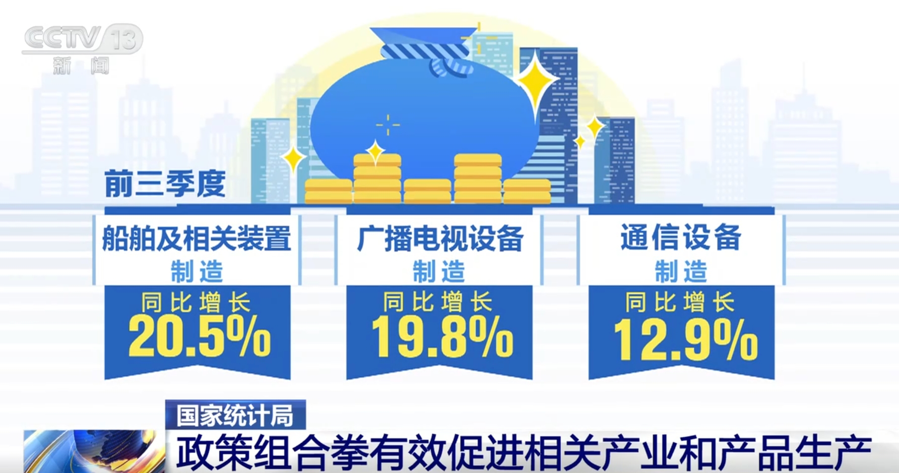 同时,有效促进了相关产业和产品的生产,前三季度,船舶及相关装置制造、广播电视设备制造、通信设备制造同比增长20.5%、19.8%、12.9%,这三个行业受大规模设备更新带动,增长都比较快。