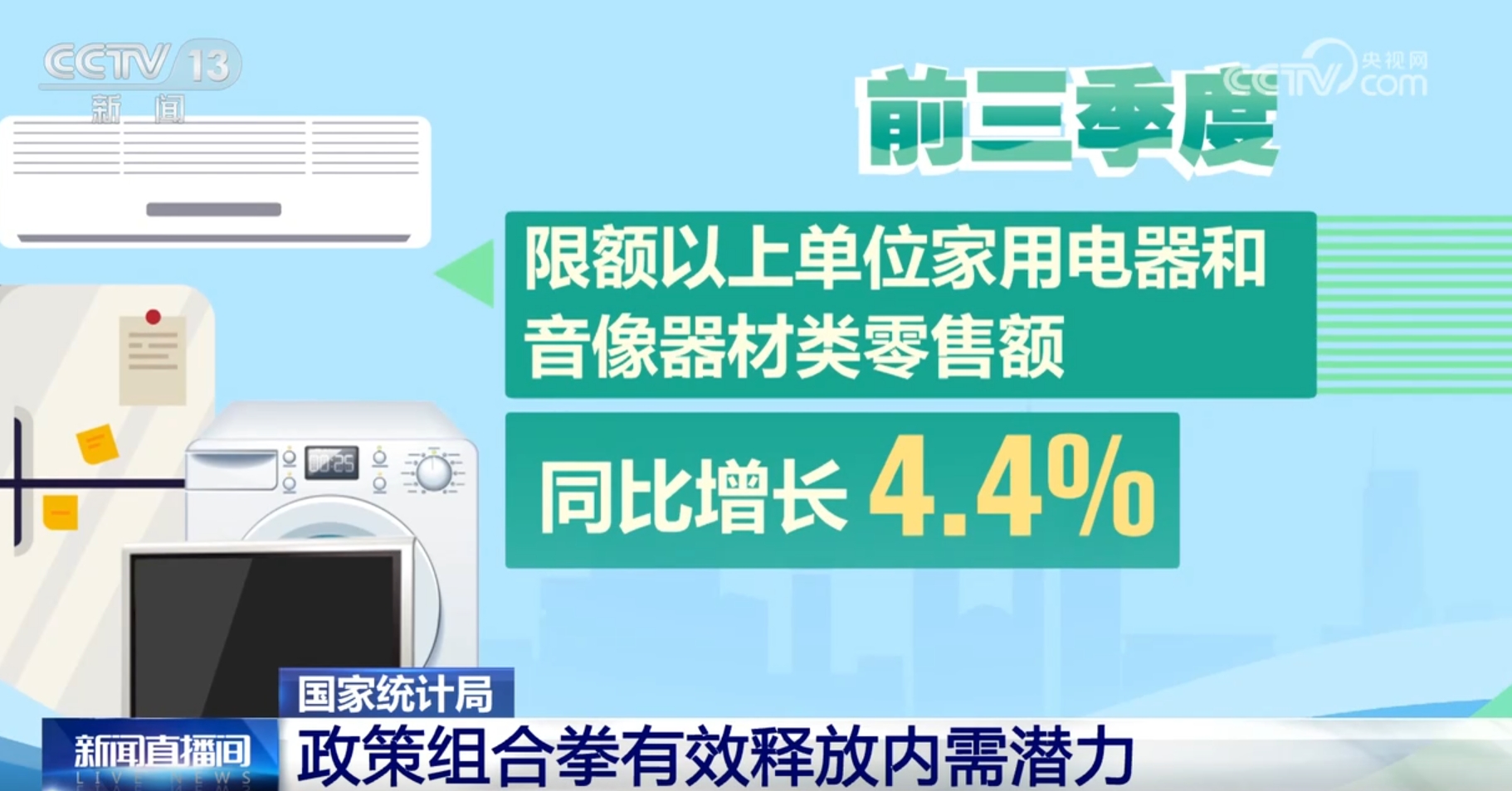 政策组合拳有效释放了内需潜力。从消费来看,在消费品以旧换新政策的作用下,前三季度,限额以上单位家用电器和音像器材类零售额同比增长4.4%,这其中9月份涉及以旧换新政策的汽车、家电、办公用品、家居等产品的零售表现更为明显。