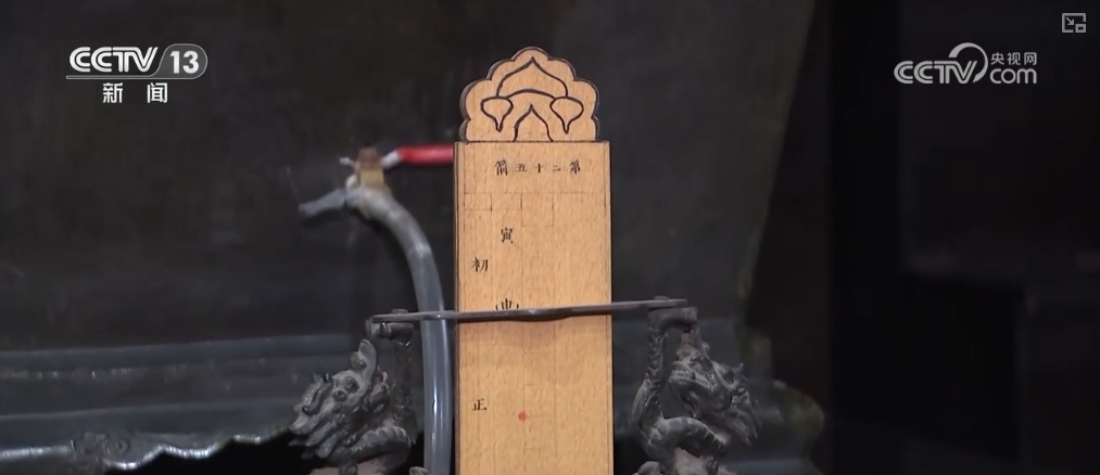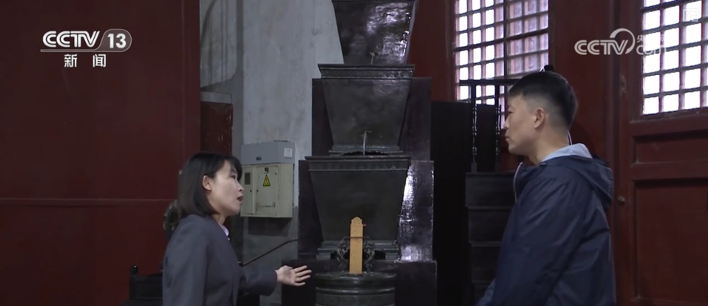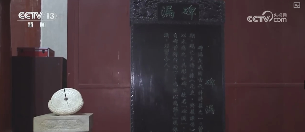 谭妍介绍,在最上面这个方岛形的壶里装满水,这个水会逐级流送到最下方流到这个圆柱形的收水壶里。这有一个双龙抱扶箭尺,它会根据水的浮力来上升,显示相应的刻度,代表相应的时间,这个红点就是代表当时的日出和日落的时间。