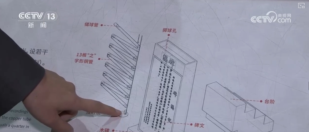 北京市钟鼓楼文物保管所工作人员谭妍介绍,碑漏是元代鼓楼初建的时候使用的一种计时仪器,里边有12根“之”字形排列的曲筒,最上方有一个储球桶。当第一个金属小球随着这12根“之”字形的曲筒滚落到最下方有一个圆形的铜铙,这个铜铙发出响声,全程是24秒。一天24个小时,需要滚动3600个金属小球,以此来换算时间。
