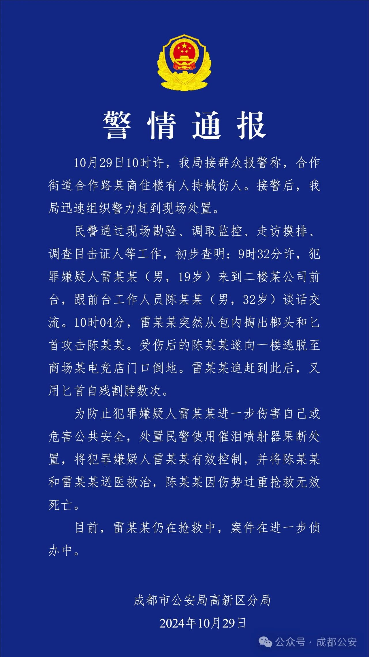 央视网消息:据“成都公安”公众号消息,10月29日10时许,警方接群众报警称,合作街道合作路某商住楼有人持械伤人。民警通过现场勘验、调取监控、走访摸排、调查目击证人等工作,初步查明:9时32分许,犯罪嫌疑人雷某某(男,19岁)来到二楼某公司前台,跟前台工作人员陈某某(男,32岁)谈话交流。10时04分,雷某某突然从包内掏出榔头和匕首攻击陈某某。受伤后的陈某某遂向一楼逃脱至商场某电竞店门口倒地。雷某某追赶到此后,又用匕首自残割脖数次。为防止犯罪嫌疑人雷某某进一步伤害自己或危害公共安全,处置民警使用催泪喷射器果断处置,将犯罪嫌疑人雷某某有效控制,并将陈某某和雷某某送医救治,陈某某因伤势过重抢救无效死亡。目前,雷某某仍在抢救中,案件在进一步侦办中。