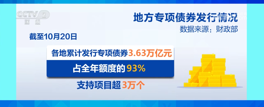 数据显示,9月份,全国一般公共预算支出、政府性基金预算支出同比分别增长5.2%和34.2%。同时,地方专项债券发行加速,9月发行约占全年额度的26%。截至10月20日,各地累计发行专项债券3.63万亿元,占全年额度的93%,支持项目超3万个。
