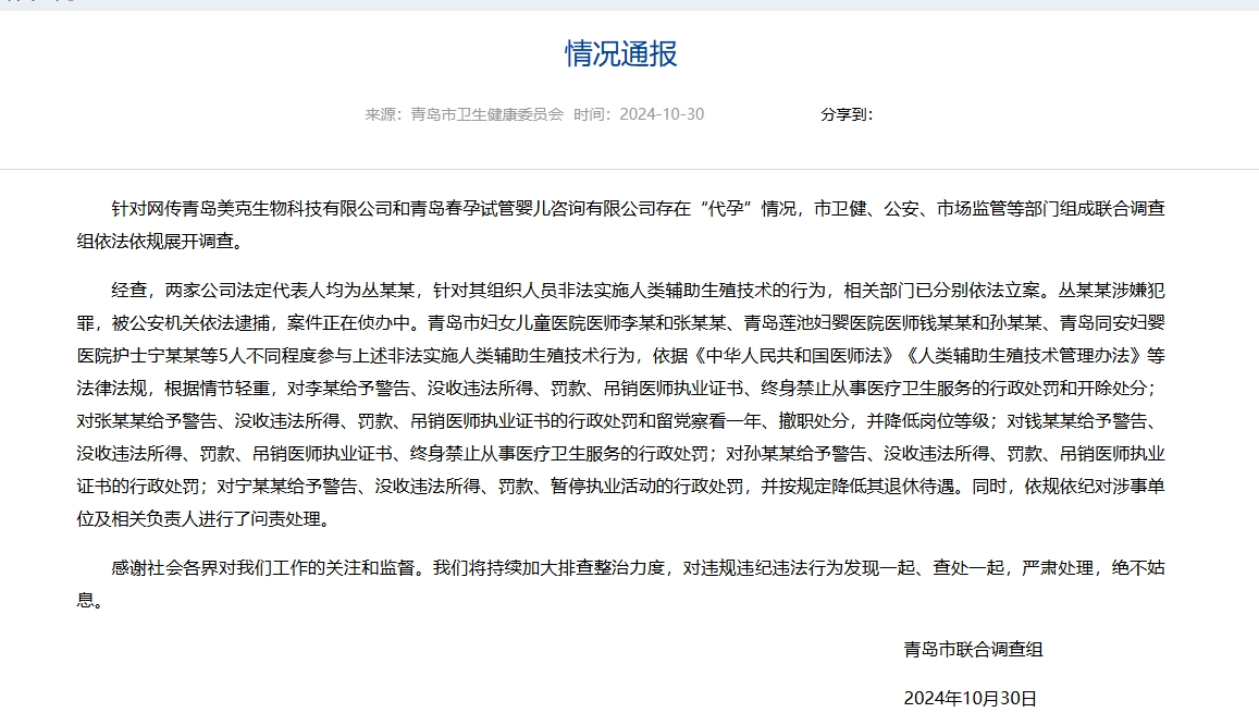 正在阅读:青岛市某生物公司开展代孕?官方通报调查情况