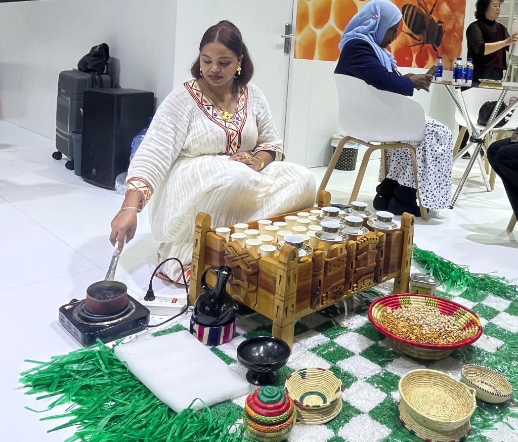 在埃塞俄比亚国家馆展区,埃塞俄比亚咖啡师在现场烘焙咖啡豆,展示当地咖啡文化。(受访者供图)