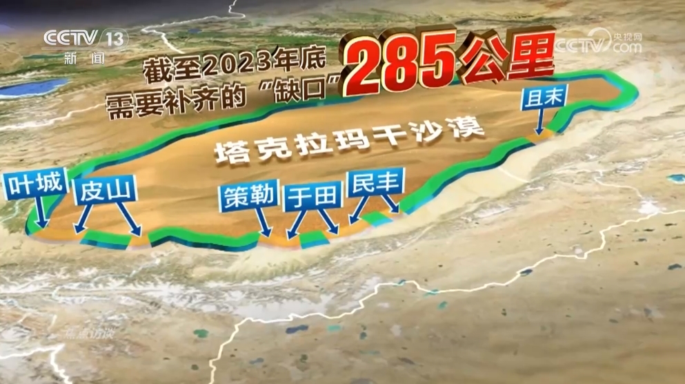 环绕塔克拉玛干沙漠边缘一圈的长度是3046公里。虽然经过40多年的治理,塔克拉玛干沙漠周边已形成了长达2761公里的绿色阻沙防护带,但截至2023年底仍有285公里的缺口,主要分布在沙漠南缘沿线的叶城、皮山、策勒、于田、民丰、且末等县域。目前,这285公里缺口已经完成了86%,仅剩最后的40公里。