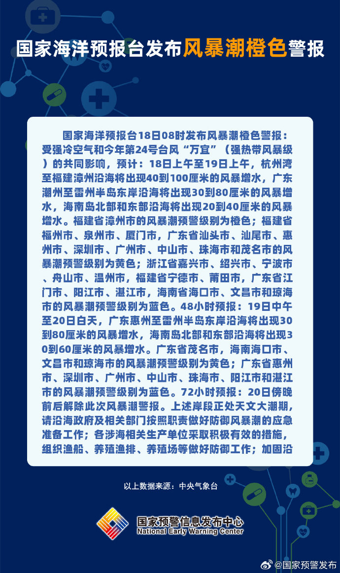 国家海洋预报台18日08时发布风暴潮橙色警报:受强冷空气和今年第24号台风“万宜”(强热带风暴级)的共同影响,预计:18日上午至19日上午,杭州湾至福建漳州沿海将出现40到100厘米的风暴增水,广东潮州至雷州半岛东岸沿海将出现30到80厘米的风暴增水,海南岛北部和东部沿海将出现20到40厘米的风暴增水。福建省漳州市的风暴潮预警级别为橙色;福建省福州市、泉州市、厦门市,广东省汕头市、汕尾市、惠州市、深圳市、广州市、中山市、珠海市和茂名市的风暴潮预警级别为黄色;浙江省嘉兴市、绍兴市、宁波市、舟山市、温州市,福建省宁德市、莆田市,广东省江门市、阳江市、湛江市,海南省海口市、文昌市和琼海市的风暴潮预警级别为蓝色。