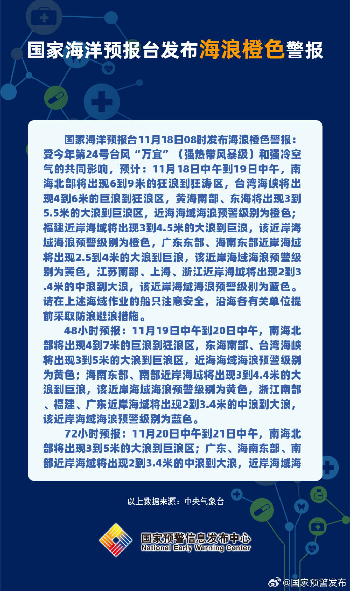 央视网消息:据国家预警信息发布中心官方微博消息,国家海洋预报台11月18日08时发布海浪橙色警报:受今年第24号台风“万宜”(强热带风暴级)和强冷空气的共同影响,预计:11月18日中午到19日中午,南海北部将出现6到9米的狂浪到狂涛区,台湾海峡将出现4到6米的巨浪到狂浪区,黄海南部、东海将出现3到5.5米的大浪到巨浪区,近海海域海浪预警级别为橙色;福建近岸海域将出现3到4.5米的大浪到巨浪,该近岸海域海浪预警级别为橙色,广东东部、海南东部近岸海域将出现2.5到4米的大浪到巨浪,该近岸海域海浪预警级别为黄色,江苏南部、上海、浙江近岸海域将出现2到3.4米的中浪到大浪,该近岸海域海浪预警级别为蓝色。