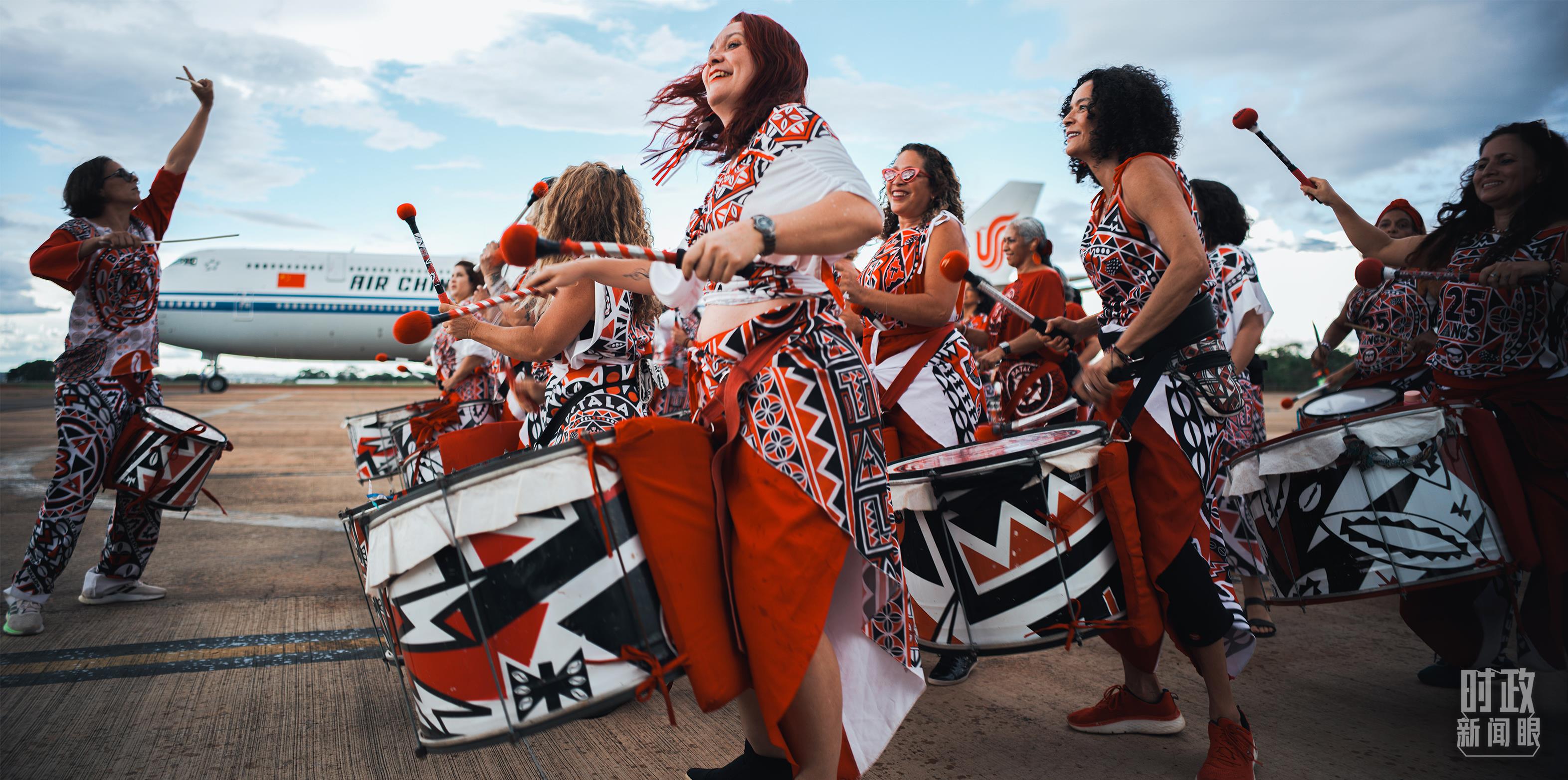 △习主席乘专机抵达巴西利亚,艺术家演奏特色鼓乐。(总台央视记者彭汉明拍摄)