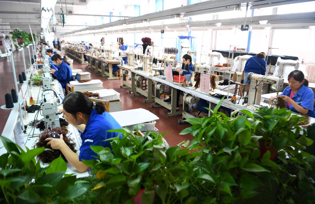 工作人员在河南瑞贝卡发制品股份有限公司的生产车间里制作假发。新华社记者 郝源 摄