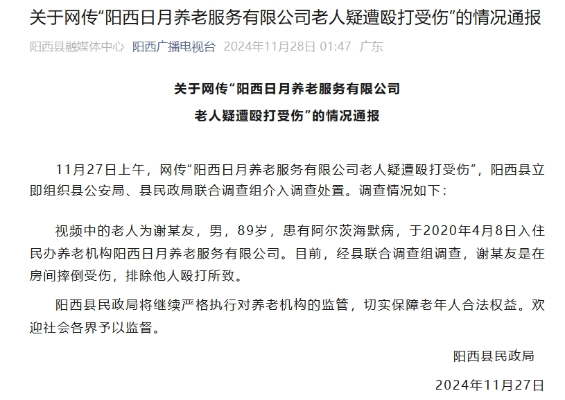 中新网11月28日电 据“阳西广播电视台”微信公众号消息,广东省阳西县民政局日前发布通报称,11月27日上午,网传“阳西日月养老服务有限公司老人疑遭殴打受伤”,阳西县立即组织县公安局、县民政局联合调查组介入调查处置。调查情况如下:
