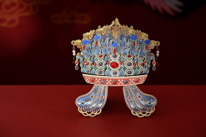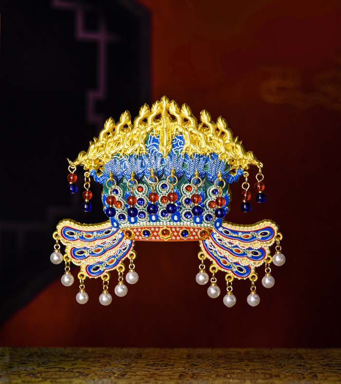 和文物的繁复工艺类比,凤冠冰箱贴在文创类别中也属精工细作。它在设计上延续了九龙九凤冠的华丽风格。设计师通过3D打印技术精确还原了凤冠的形态,同时采用木质和金属两种材料,呈现出质感上的多样化。每一粒串珠,都由工人手工组装完成,可谓“粒粒皆辛苦”。而凤冠中间椭圆形红色宝石的选择与镶嵌,体现了中国传统文化中对自然形态的尊重和审美偏好。