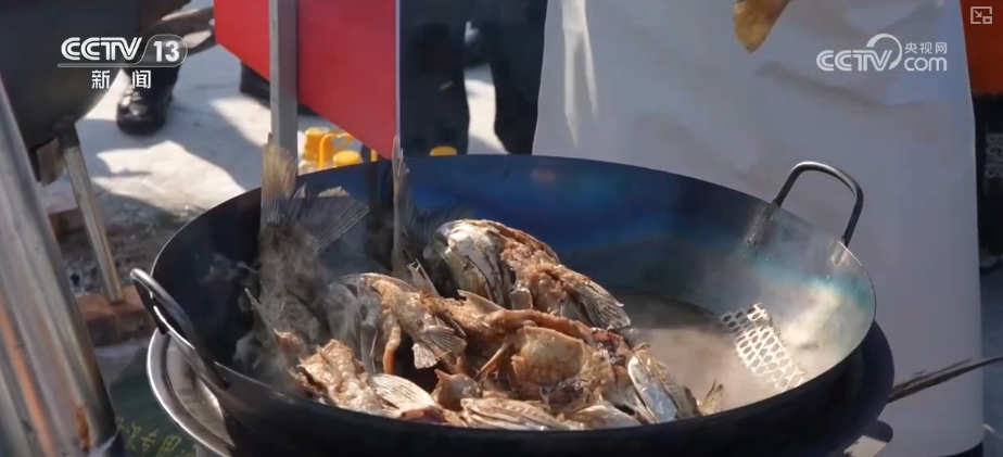 随着大网出水,祭湖醒网、拍卖头鱼等各种和冬捕有关的活动接连展开。现场还设置了12口大铁锅,新鲜上岸的鱼被即刻烹制,游客可畅享舌尖上的鲜味。