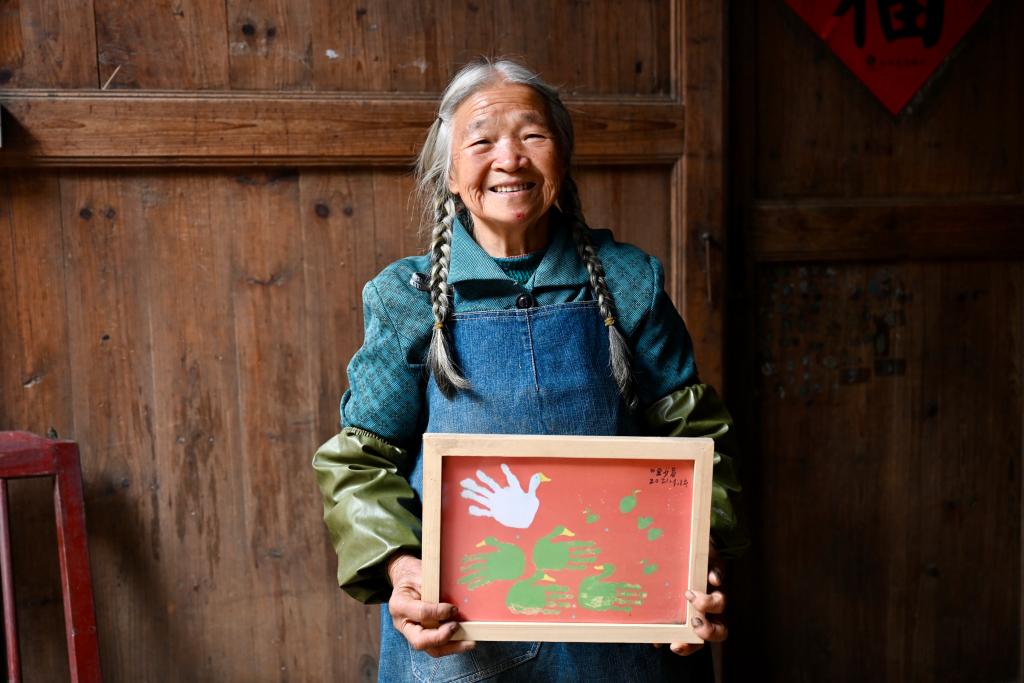 “辫子奶奶”叶金娟向记者展示她创作的拓印画。新华社记者 刘铭翔 摄