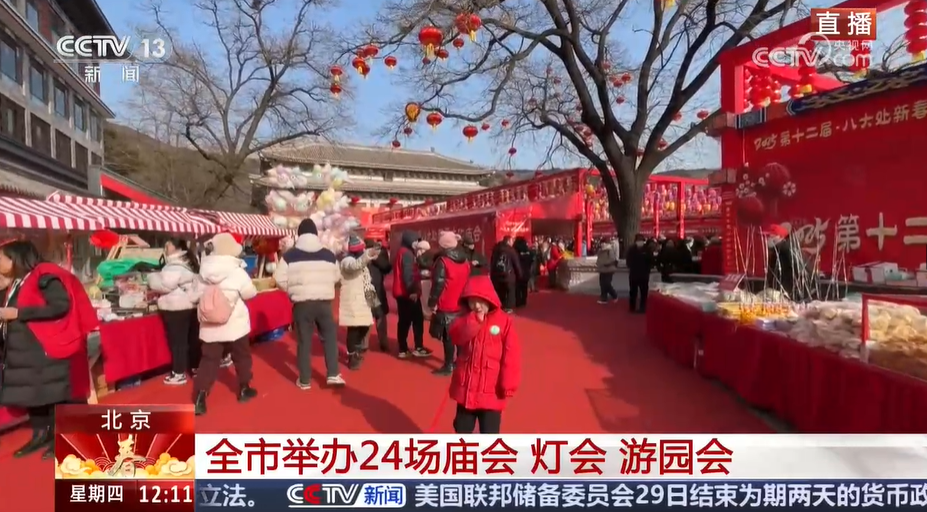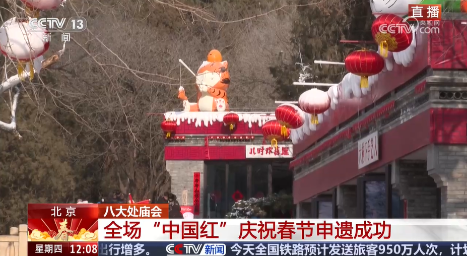 总台记者 张河运:我现在所在的位置就是北京八大处文化庙会的现场,为庆祝春节申遗成功,本届庙会全面点亮“中国红”,以红灯笼、红色剪纸、红色春联、红色糖葫芦等元素,多要素讲述春节申遗的重要意义,营造了浓浓的年味。