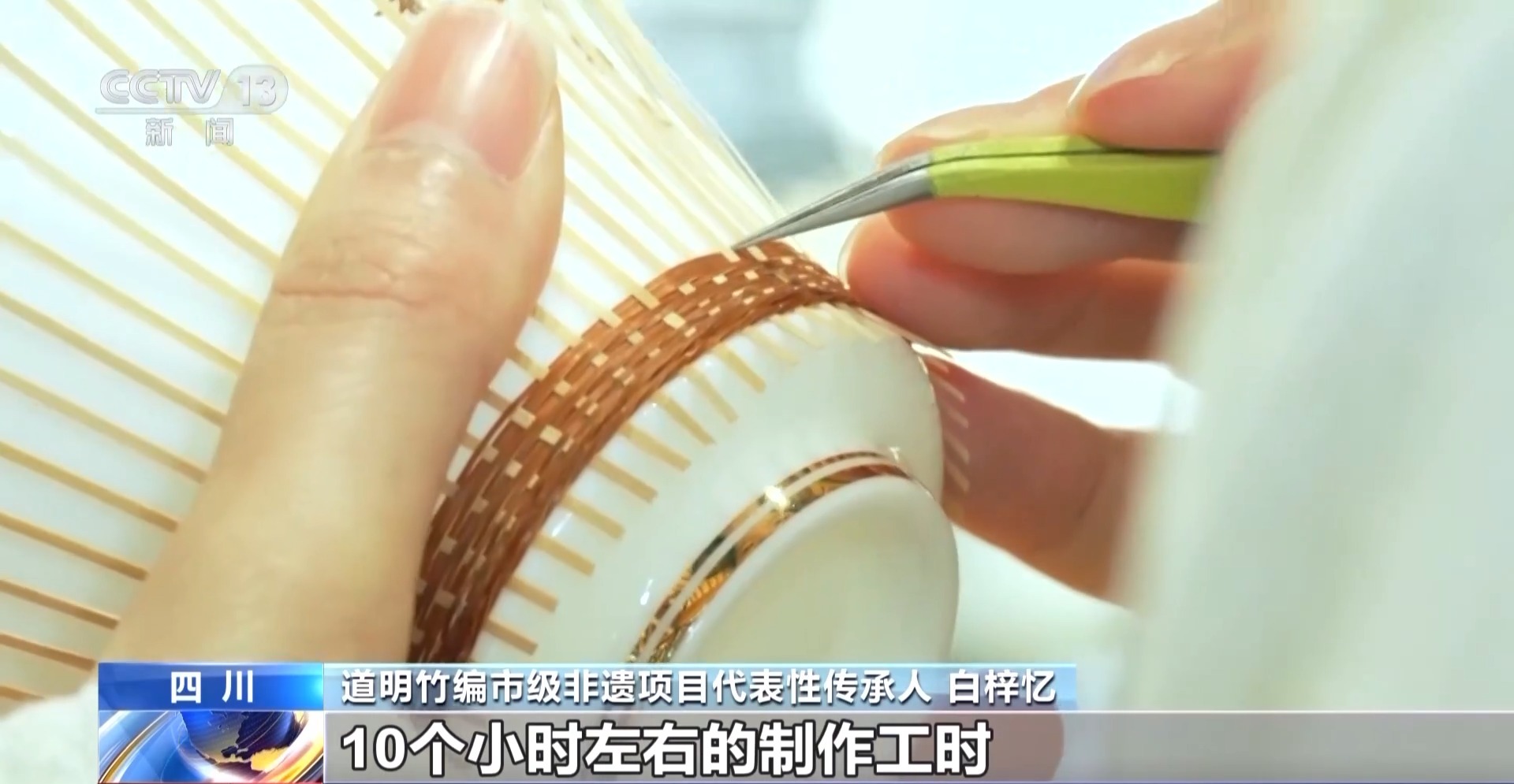 道明竹编市级非遗项目代表性传承人 白梓忆:其实能够看到我们杯体上的这个竹编,它其实是用比头发丝稍微会粗一点的竹丝编织而成。在编织过程当中,可能会用到六七十根竹丝,大概一个成品可能需要10个小时左右的制作工时,所以看起来小小的,其实极其需要耐心和时间。