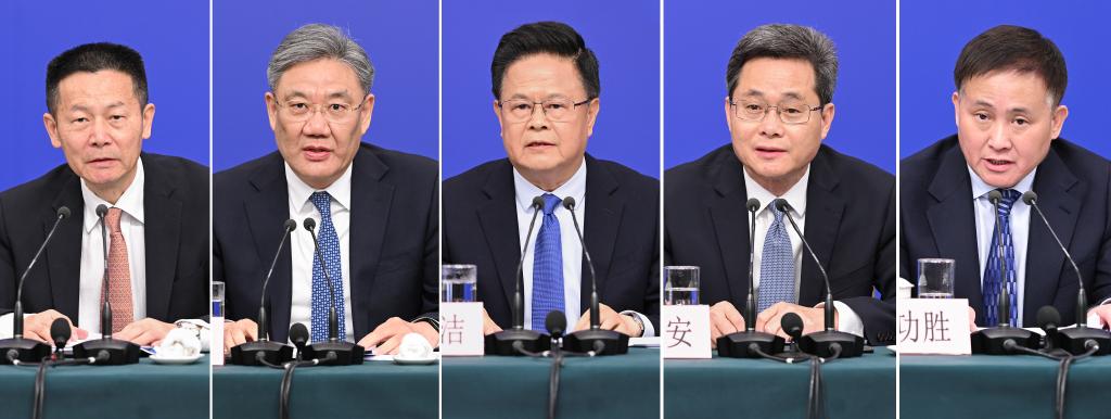 3月6日,十四届全国人大三次会议在北京梅地亚中心新闻发布厅举行记者会。国家发展和改革委员会主任郑栅洁(中)、财政部部长蓝佛安(右二)、商务部部长王文涛(左二)、中国人民银行行长潘功胜(右一)、中国证券监督管理委员会主席吴清(左一)就发展改革、财政预算、商务、金融证券等相关问题回答中外记者提问(拼版照片)。新华社记者 胥冰洁 摄