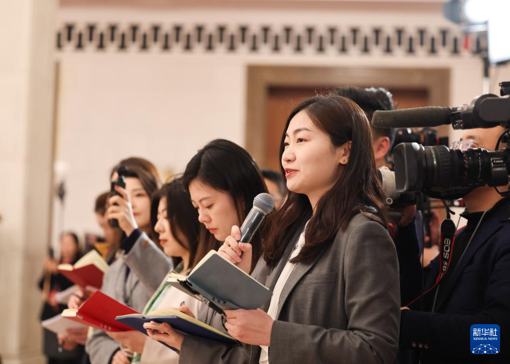 3月7日,全国政协十四届三次会议第二场“委员通道”集体采访活动在北京人民大会堂举行。这是记者在提问。新华社记者 殷刚 摄