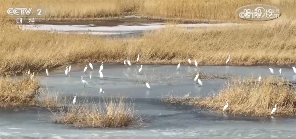 在克拉玛依市古海湿地生态公园,三十余只白鹭与苍鹭在芦苇荡中翩翩起舞。白鹭、苍鹭一会儿掠过冰面,一会儿伫立在冰面上,时动时静,非常有趣。