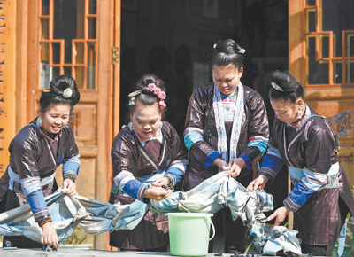 侗族妇女在扎染侗布。新华社记者 杨文斌摄