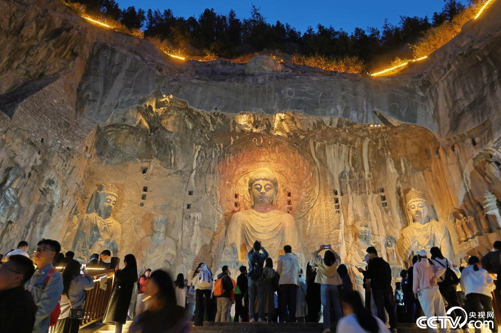 4月1日,河南洛阳,游客在夜色中游览洛阳龙门石窟。