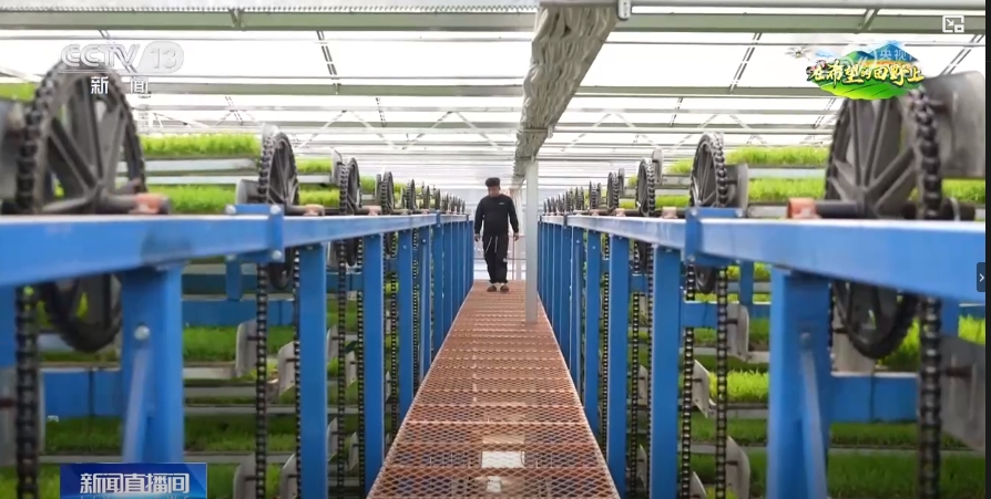 在旁边的玻璃大棚内,循环式智能育秧机正在运行,一盘盘秧苗坐上5米高的育秧机,轮流接收光照和水养分补给。先进的温控和湿控系统,让秧苗生长环境更稳定,也缩短了时间。