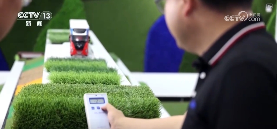 某企业技术研发总工程师林宝钢介绍,这是他们自主研发的滑雪人造草坪,具有清洁、润滑、低摩擦和高抗静电性能,能模拟天然或人工雪场。他们陆续推出了负离子草、降温草、装饰草、图案草等各种功能人造草,为绿色运动、健康运动提供了新的方案。