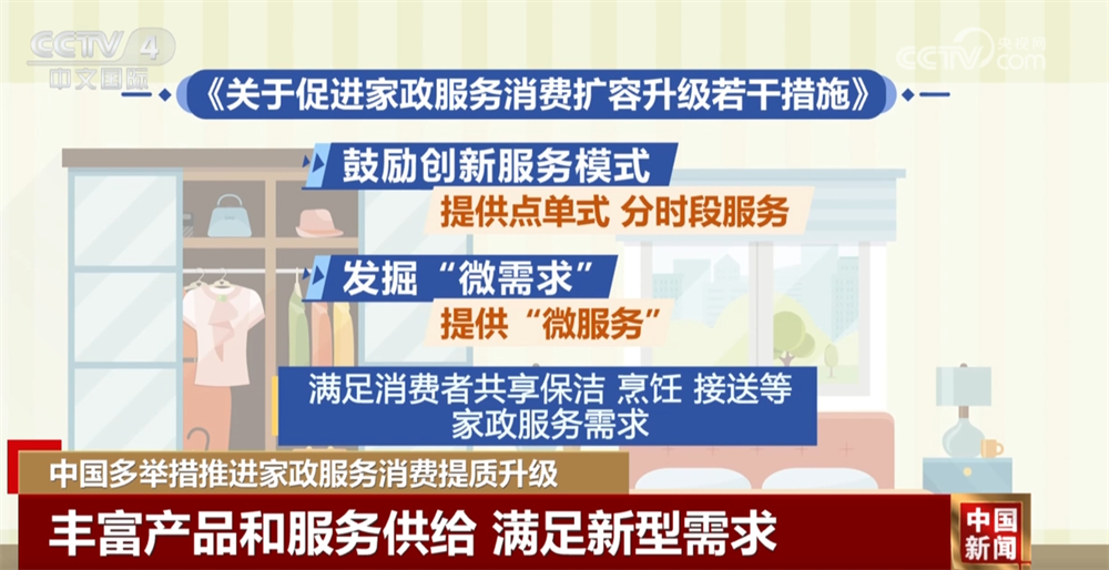 措施鼓励家政服务企业拓展深度保洁、整理收纳等新兴服务领域,加强跨界合作,进一步丰富产品和服务供给。鼓励创新服务模式,提供点单式、分时段服务,发掘“微需求”,提供“微服务”,满足消费者共享保洁、烹饪、接送等家政服务需求。