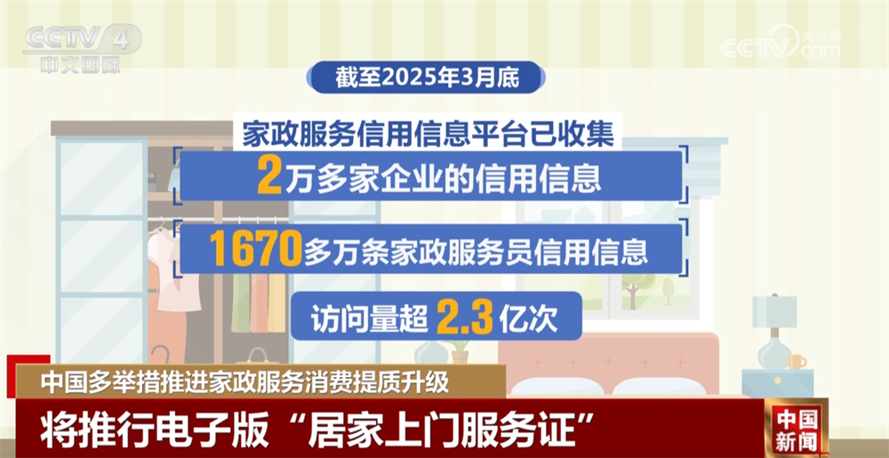 商务部将推行电子版“居家上门服务证”,依法依规向消费者展示家政服务员从业信息,商务部建立了全国家政服务信用信息管理平台,归集家政企业和家政服务员信用记录供消费者查询。截至2025年3月底,家政服务信用信息平台已收集2万多家企业的信用信息、1670多万条家政服务员信用信息,访问量超2.3亿次。