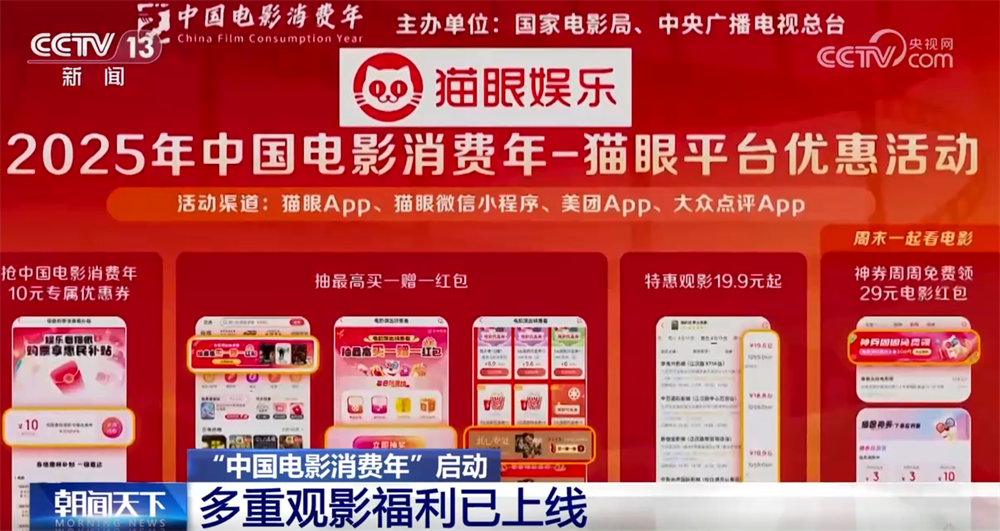 自4月18日起至2026年春节档结束,观众可在小程序等渠道进入“中国电影消费年”页面,领取消费年专属10元优惠券、抽最高“买一赠一”观影红包、参与单片19.9元起大额补贴等活动。此外,观众可在中国银联云闪付App中找到“中国电影消费年”进入专题页面,领取对应的观影福利。