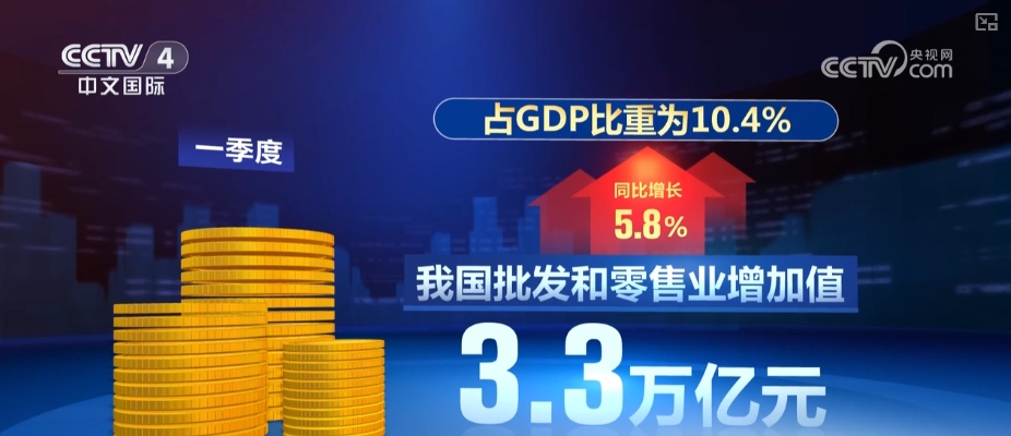 央视网消息:商务部数据显示,一季度,中国批发和零售业增加值3.3万亿元,同比增长5.8%,占GDP比重达到10.4%。