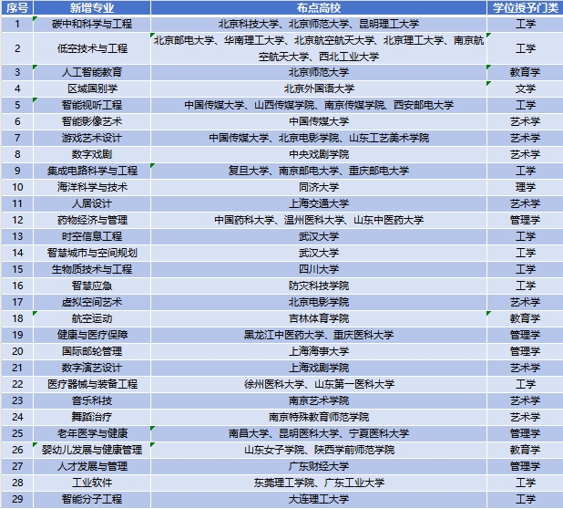 此外,从学位授予门类来说,工学专业较多,包括智能视听工程、智能分子工程、智慧应急、智慧应急、时空信息工程、生物质技术与工程等;教育学专业包括人工智能教育、航空运动等。这其中,布点高校最多的专业为智能视听工程,有4所高校设立。