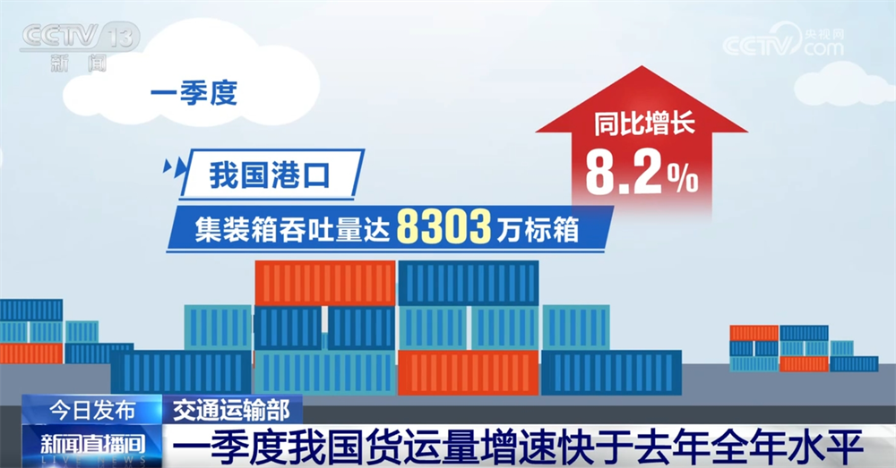 交通运输部数据显示,一季度我国完成营业性货运量130.6亿吨,同比增长4.9%,增速较去年全年加快一个百分点。港口吞吐量保持增长,集装箱吞吐量增长较快。一季度,我国港口货物吞吐量达42.2亿吨,同比增长3.2%,其中内、外贸同比分别增长4.1%和1.4%。集装箱吞吐量达8303万标箱,同比增长8.2%,其中内、外贸航线同比分别增长3.6%和11.5%。
