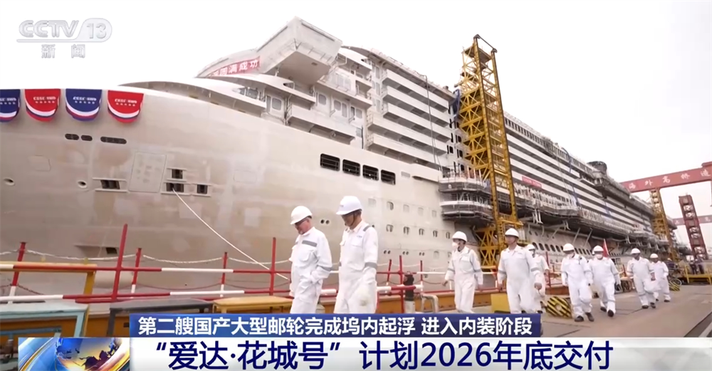 央视网消息:记者从中船集团获悉,4月28日我国第二艘国产大型邮轮“爱达·花城号”完成坞内起浮,标志着邮轮项目整体进度已完成超过70%,全面转入内装和系统完工调试阶段。
