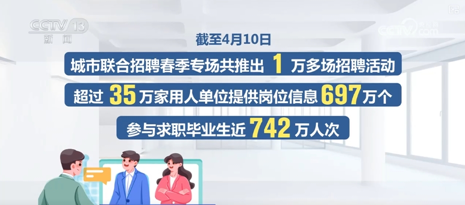 截至4月10日,城市联合招聘春季专场共推出1万多场招聘活动,超过35万家用人单位提供岗位信息697万个,参与求职毕业生近742万人次。组织“就业援助月”,持续开展春风行动、春暖农民工等活动,累计举办5.6万场招聘活动,发布岗位3700万个。