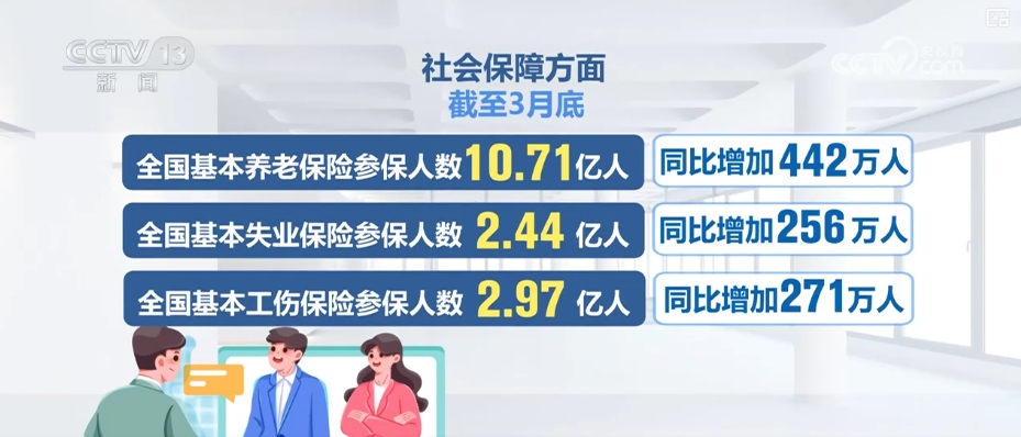 社会保障方面,截至3月底,全国基本养老、失业、工伤保险参保人数分别为10.71亿人、2.44亿人、2.97亿人,同比增加442万人、256万人、271万人。1—3月,三项社会保险基金总收入2.36万亿元、总支出1.94万亿元。3月底,累计结余9.6万亿元,基金运行总体平稳。
