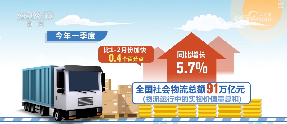 2025年一季度,全国社会物流总额,即物流运行中的实物价值量总和为91万亿元,同比增长5.7%,比1—2月份加快0.4个百分点。