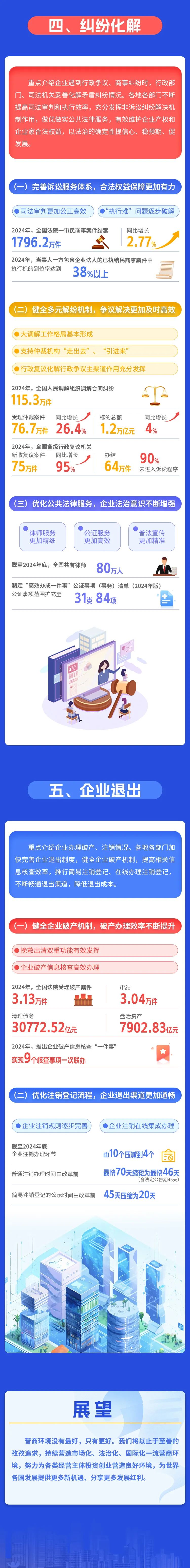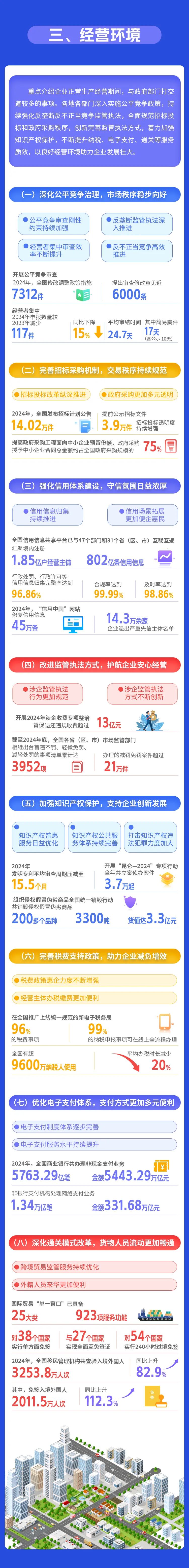 央视网消息:据国家发改委微信公众号消息,《中国营商环境发展报告(2025)》(以下简称《报告》)按照企业从设立到退出的全生命周期,分5个部分展示2024年全国层面营商环境各领域进展成效。“进入市场”部分,主要介绍破除市场准入壁垒,以及提升企业登记注册、不动产登记、项目审批服务、电水网接入便利度等方面情况。“要素保障”部分,主要介绍保障经营主体获取资金、劳动、技术、数据等生产要素情况。“经营环境”部分,主要介绍深化公平竞争治理、完善招标采购机制、强化信用体系建设、改进监管执法方式、加强知识产权保护、完善税费支持政策、优化电子支付体系、深化通关模式改革等方面情况。“纠纷化解”部分,主要介绍完善诉讼服务体系、健全多元解纷机制、优化公共法律服务等方面情况。“企业退出”部分,重点介绍健全企业破产机制、优化企业注销登记流程等方面情况。