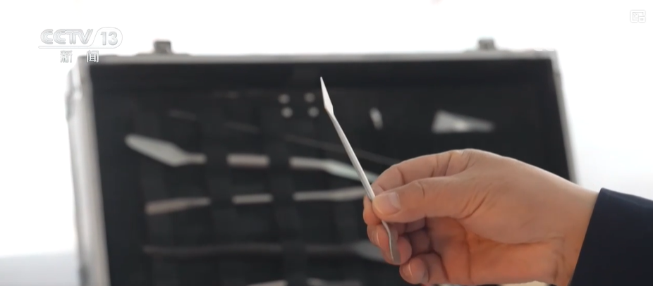 敦煌研究院里,每一个文物修复师都有一个自己的百宝箱,刘涛的箱子里藏着的近百种工具中很大一部分都是自己动手制作的。刚工作的时候,修复并没有什么专门的工具可用,大家就针对病害到处找,自己动手做。三十多年来,他反复琢磨尝试,才攒下这满满一箱。注胶他用医用针管加上洗耳球来精准控制滴量,除尘他用最软的羊毛款腮红刷,至于木质、铁质的修复刀,他做了上千把,不断地精益求精。