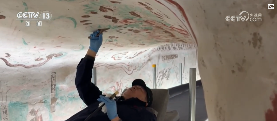 莫高窟55号窟内,退休后又被返聘的刘涛依旧坚守在一线,和徒弟们一起对窟内起甲、地仗层脱落、酥碱等多种病害的壁画进行修复。
