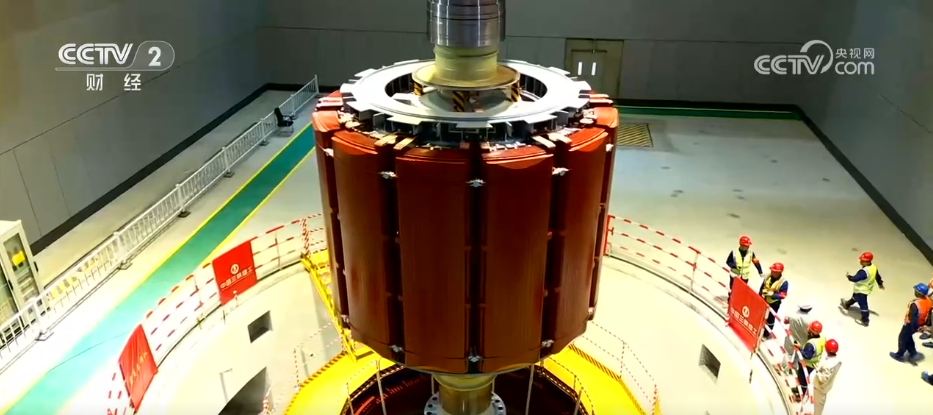 记者来到天台抽水蓄能电站的发电厂房。大家看,这个正在移动的红色圆柱形庞然大物就是发电机转子,已经被桥式起重机吊装到指定位置正上方,正平稳下落。这台转子直径接近5米、重达481吨。工作人员告诉记者,在这个过程中要讲究安全、平稳、精准,桥机操作人员和地面指挥人员需要密切配合,转子下落过程中,与定子的单边间隙仅有5厘米左右,吊装成功后也就标志着机组开始进入总装阶段,首机投产发电指日可待。作为国内单机容量最大的抽水蓄能机组,天台电站单机容量达425兆瓦,四台机组满负荷运行时,每小时发电量可达170万度,足以满足一座中型城市的瞬时用电需求。