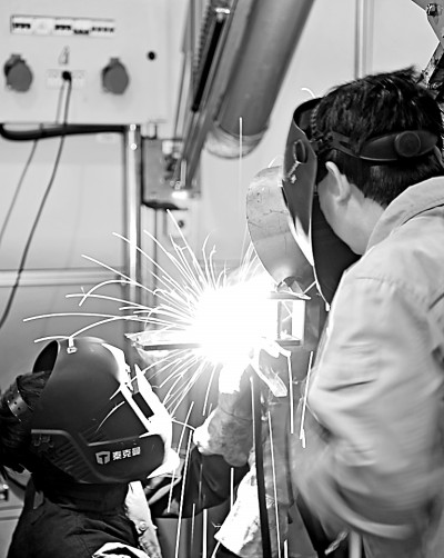 中石化第四建设有限公司工匠学院焊接教练张振连(右)在天津职业技术师范大学焊接实训室指导学生。新华社发