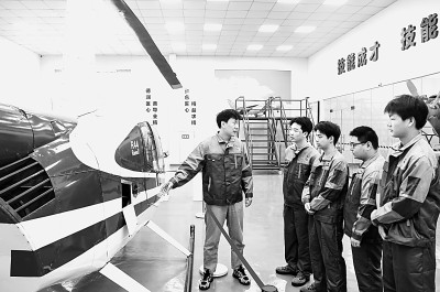 重庆城市职业学院航空学院教师(左一)在为学生们讲解直升机绕机检查的注意事项。新华社发