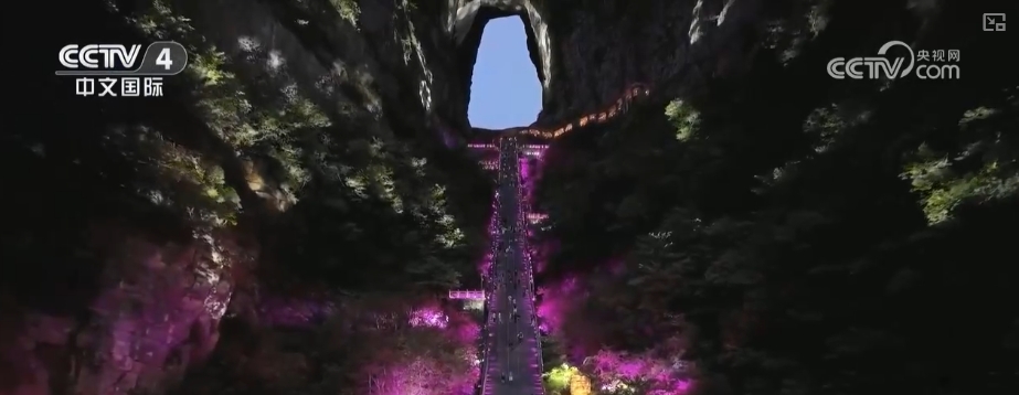 “五一”假期,湖南天门山景区以自然风光吸引中外游客。随着夜幕降临,天门山山体被五彩灯光点亮,999级彩虹台阶灯光流转,远看就像一道连通天地的彩虹桥,将千年奇观天门洞装点得更加巍峨壮观。