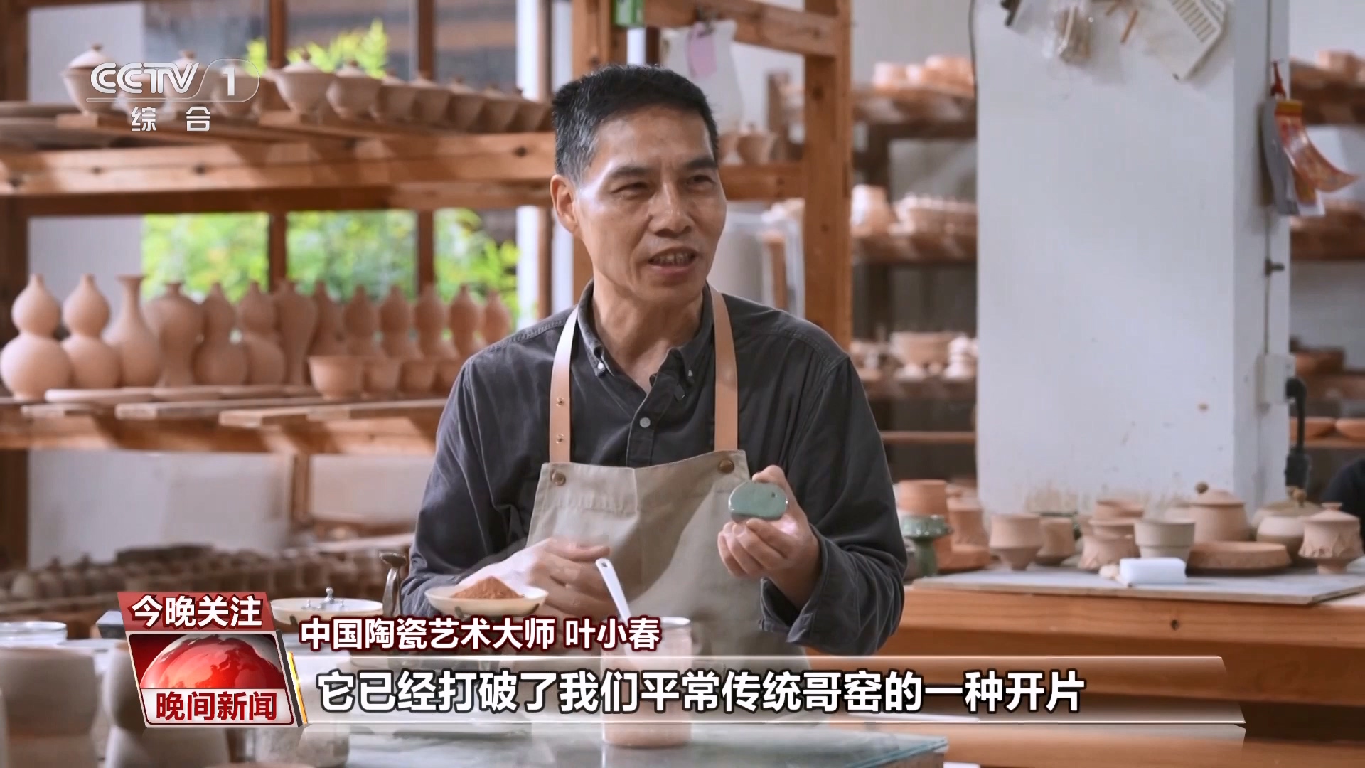 中国陶瓷艺术大师 叶小春:这个纹片裂出来,当时我是非常兴奋,它已经打破了我们平常传统哥窑的一种开片。传统哥窑开片它是这样的,两块对比就很明显了。看到这么一点,当时我也兴奋得不得了。