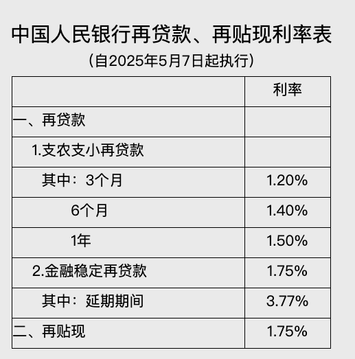 央视网消息:5月7日,中国人民银行公布再贷款、再贴现利率表:3个月、6个月和1年期支农支小再贷款利率分别为1.2%、1.4%和1.5%,金融稳定再贷款利率为1.75%,其中延期期间为3.77%,再贴现利率为1.75%。