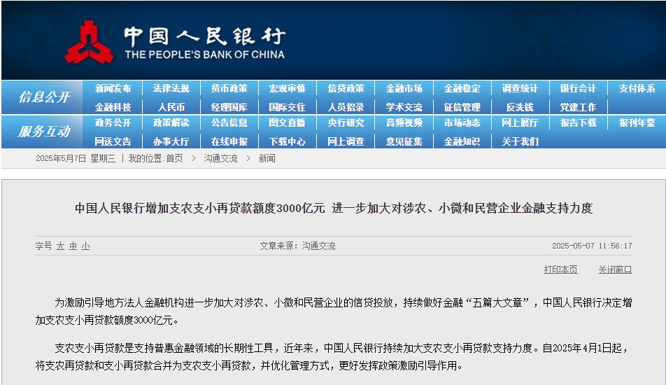 央视网消息:为激励引导地方法人金融机构进一步加大对涉农、小微和民营企业的信贷投放,持续做好金融“五篇大文章”,中国人民银行决定增加支农支小再贷款额度3000亿元。